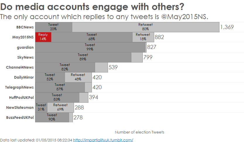 Corporate accounts don’t deign to reply to anyone – they broadcast. @May2015NS stands out as pretty much the only account that engages with people: 14% of its tweets since March 30th have been replies.